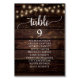 Wedding Dinner Guest Seating Table Chart Card, Modern Rustic Script, String lights, Dark Wood background