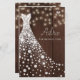 White shiny diamonds wedding dress on a dark dark brown barn wood with strings of twinkle lights background making a simple modern elegant bridal shower advice card.