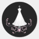 Lovely black and white envelope sticker, with a white wedding dress on a stand and pretty pink fleurs at the the bottom. Great as seals to your bridal shower invitation envelopes.