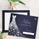 White shiny diamonds wedding dress on a dark midnight navy blue chalkboard background making a simple modern elegant bridal shower advice card.