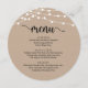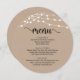 Modern Rustic Brown Kraft, String Lights, Round Plate shapes, Wedding elopement Dinner, Brunch and Lunch Menu. A perfect menu card for your big day. You can change the script font colours and change the menu contents and fonts to meet your needs.