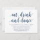 Modern Script in Classy Navy Blue themed, wedding elopement invitation card (Eat, Drink and Dance). It is perfect for your wedding elopement casual lakeside wedding dinner, dancing and party.