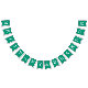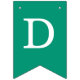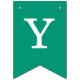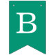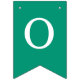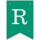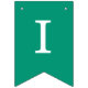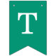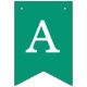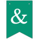 A simple bunting flags banner for a emerald green wedding, with the names of the bride and groom, with white caps on teal background.