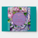 "You Are Cordially Invited to Attend The Wedding of -The Parties- ", In Holy Matrimony & The Date", inside A Circle Horizon (Violet with Plum Border), surrounded by a Boquete of Pink & Violet Peonies with flowing Satin, Violet Ribbon & Bow, with "Date", above & "Official Invitation inside", below Circle Horizon, all on Violet background. - Enlarged Flower background, Leaving Very Wide Border at side & Bottom edges & Pink Tulips match up. -----