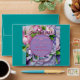 Beautiful & Elegant, Boquete of Pink & Violet Peonies with Satin Violet Bow at Bottom, surrounding A (Violet) Circle Horizon, topped with "Our Wedding" & "Date", on Layered (Two Shades at Top) Violet background.