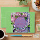 Beautiful & Elegant, Boquete of Pink & Violet Peonies with Satin Violet Bow at Bottom, surrounding A (Violet) Circle Horizon, topped with "Our Wedding" & "Date", on Layered (Two Shades at Top) Violet background.