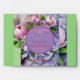 "You Are Cordially Invited to Attend The Wedding of -The Parties- ", In Holy Matrimony & The Date", inside A Circle Horizon (Violet with Plum Border), surrounded by a Boquete of Pink & Violet Peonies with flowing Satin, Violet Ribbon & Bow, with "Date", above & "Official Invitation inside", below Circle Horizon, all on Violet background. - Enlarged Flower background, Leaving Very Wide Border at side edges & Tulips match up. -----