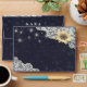 Wedding 5x7 Envelope Templates - Elegant Sunflowers, Vintage Lace Frame and Chic String Lights on Navy Blue Background.