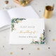 For an elegant wedding. A chic white background. Decorated with green eucalyptus leaves, sprigs, greenery and faux gold foliage. Personalise and your names. Black and golden letters.