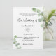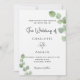A white background decorated with eucalyptus greenery sprigs. Personalise and your name and ceremony details. Black coloured letters.