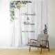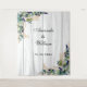 For a rustic wedding. Chic rustic white wood as background. Decorated with green watercolored eucalyptus leaves, sprigs, greenery and a faux gold leaves. Personalise and add the names of the bride and groom, and the date. Black and golden letters. Can be used as a welcome banner, as party wall decoration or as a photo booth backdrop.