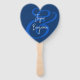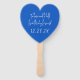 Handheld wedding fan in navy and bright blue. Modern fonts for names of the couple on the front, with a large “and” sign. Include the date of ceremony and “To have and to hold from this day forward” on the back. Shown on the heart-shaped fan, but this design works on all shapes.