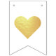 A simple bunting flags banner for a wedding, with the words "Mr. & Mrs." and the family name of the new couple and 3 hearts. The text is in white caps on faux gold foil background,  the hearts and the ampersand are faux gold foil on white background.