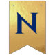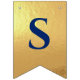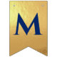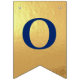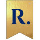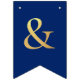 A bunting flags banner for a wedding with royal blue and gold wedding colours, with the words "Mr. & Mrs." and the family name of the new couple and 3 hearts. The text is in royal blue caps on faux gold foil background, the hearts and the ampersand are faux gold foil on royal blue background.