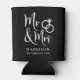 Give a wedding toast and your wedding guests a fun souvenir keepsake of your special day with this custom black can cooler with "Mr & Mrs" written in a large white script and an illustration of two wedding rings joined together. Add your name and wedding date below.