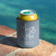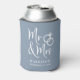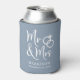 Give a wedding toast and your wedding guests a fun souvenir keepsake of your special day with this custom dusty blue can cooler with "Mr & Mrs" written in a large white script and an illustration of two wedding rings joined together. Add your name and wedding date.