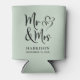 Give a wedding toast and your wedding guests a fun souvenir keepsake of your special day with this custom sage green can cooler with "Mr & Mrs" written in a large script and an illustration of two hearts joined together. Add your name and wedding date below.