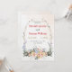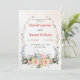 This wedding invitation features a beautiful floral bow with a variety of blooms of pink, purple and yellow. Delicate branches and leaves extend from the top, creating an elegant expanse of floral frame. A soft watercolor background adds a timeless, romantic touch.