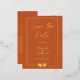 Wedding Save the Date foil postcard adds an elegant touch to your save the dates. The front of the wedding postcard features real foil. Customise the text on the front and back of the wedding save the date. Great for couples using terracotta as their featured wedding colour. Terracotta and gold colours. Use the template to create your own wedding foil save the date terracotta postcard.