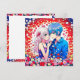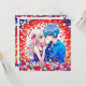 Personalised thank you notes for your anime themed wedding. Red, blue and white flowers and a cute anime couple cuddling.