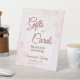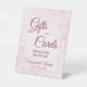 This pretty tabletop sign is designed to make it easy for your wedding guests to know where to leave their gifts and cards. It features a simple yet elegant dusty rose colored script lettering on a background of watercolor peony flowers and leaves in pastel shades of cotton candy blush pink. The sign reads: Gifts and Cards Thank you so much! There is room for your names and the wedding date below.