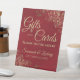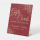 This pretty tabletop sign is designed to make it easy for your wedding guests to know where to leave their gifts and cards. It features a simple yet elegant crimson red and gold design with script lettering and lacy golden faux foil frills in the corners. The sign reads: Gifts and Cards Thank you so much! There is room for your names and the wedding date below.