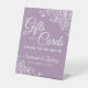 This pretty tabletop sign is designed to make it easy for your wedding guests to know where to leave their gifts and cards. It features a simple yet elegant lavender purple design with script lettering and lacy white frills in the corners. The sign reads: Gifts and Cards Thank you so much! There is room for your names and the wedding date below.
