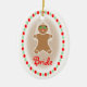 A Christmas ornament featuring an illustration of a gingerbread bride complete with pearls, tiara, and veil. Background is light brown and surrounded with red and green candies. Personalise the red text under illustration.