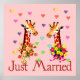Two cute giraffes hold bouquets of flowers as rainbow coloured hearts surround them. Equally lovely for a gay or straight wedding rehearsal, informal ceremony, and reception.