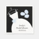 Pretty bridal shower paper napkin featuring a stylised wedding gown and flowers in blue and white on a black background. A customisable design for you to personalise with your own text, pictures and ideas.