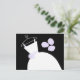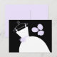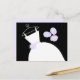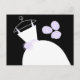 Bridal themed post card with a pretty design in shades of purple, black and white featuring a stylised wedding dress on a hanger accompanied by a bouquet on the front, and pale purple back. A customisable design for you to personalise with your own text, pictures and ideas.