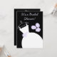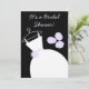 Pretty bridal shower invitation featuring a stylised wedding gown and flowers in shades of purple and white on a black background, and white and purple text. A customisable design for you to personalise with your own text, pictures and ideas.