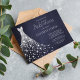 White shiny diamonds wedding dress on a dark navy blue chalkboard background making a modern elegant rustic inspired bridal shower invitation.