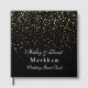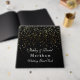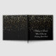 This guest book is shown in a black colour with a curtain of golden coloured petite stars on both front and back are splattered all over this guest book. Front has text reading your two personalised names in a fancy script, your last name in bold text style.