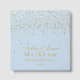 This guest book is shown in a custom colour of Blue Fog-a light Dusty Blue with gold-coloured, not "gold", text and with a curtain of Golden-Tan coloured petite stars on both front and back are splattered all over this guest book. Front and spine has text reading your two personalised names in a fancy script, your last name in bold text style along with custom date beneath.