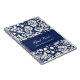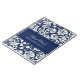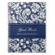 Spiral wedding guest book notebook in dark navy blue and cream off white classic floral damask pattern, with customisable text to add your own name and wedding date.