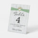 Sage green ribbon in a gold heart with baby's breath bouquet on rustic whitewashed wood for table number tent.