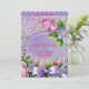 "Invitation to The Wedding of The Parties, In Holy Matrimony & The Date", inside A (Violet with Plum Border) Circle Horizon, surrounded by a Boquete of Pink & Violet Peonies with flowing Satin, Violet Ribbon & Bow, with "Date", above & "Day, Time & Wedding Venue", below Circle Horizon, all on Violet background.