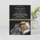 This unique design combines a formal wedding invitation with a vibrant hot rod illustration. The upper section features details for his name and her name wedding celebration on "Saturday, January 18, 20XX" in Vancouver, BC. Below, a powerful, brightly coloured hot rod with exposed engine and exhaust pipes speeds forward, creating a striking contrast of themes. all customisable.