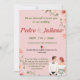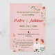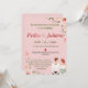 These elegant spring floral wedding invitations feature special details for your wedding party of pink flowers and lush green leaves. Personalise your pink wedding invitations by adding your names and wedding details. Spring wedding invitation reflected on a pink background. Perfect for spring and summer weddings, garden weddings, etc.