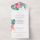 These destination wedding invitations with rsvp card feature feature tropical watercolor flowers and palm leaves in shades of pink, orange and green. An elegant choice for a seal and send or folded marriage invites. To see more affordable wedding invitation ideas visit www.zazzle.com/dotellabelle