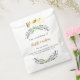 A chic white background. Decorated with lavender flowers and eucalyptus greenery. Personalise and add the names of the bride and groom, a date and a thank you note. Black and golden letters.