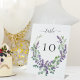 A stylish white backgrond decorated with violet, lavender florals and eucalyptus greenery. Personalise and your table numbers. Black letters.