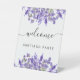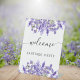 A welcome sign for a party. A white background, decorated with watercolored lavender florals, flowers. Personalise and add your name. Black letters.