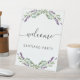 A welcome sign for a party. A white background, decorated with lavender, florals and eucalyptus greenery. Personalise and add your name. Black letters.