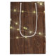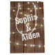 Glowing wedding white light strings and bride and groom names on rustic wood background.