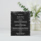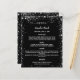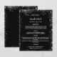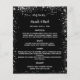 An elegant, glamourous wedding menu. A black background, decorated with faux silver glitter, sparkles. White text. Personalise and add your name, dates and the menu.