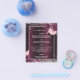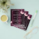 An elegant, glamourous wedding menu. A deep burgundy gradient background, decorated with faux silver glitter, sparkles and pink and burgudny flowers. White text. Personalise and add the menu.