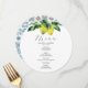 This wedding menu card features a top boarder of watercolor lemons and botanicals. The card reverses to a Amalfi tile pattern. Use the template fields to DIY your personalised details. The elegant round design is a charming choice for Italy destination weddings. To see more custom Italian wedding dinner menus and ideas like this visit www.zazzle.com/dotellabelle