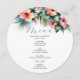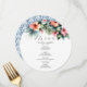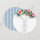 This wedding menu card features a top boarder of watercolor hibiscus flowers in shades of pink and orange. The card reverses to reveal a watercolor ornate pattern in a classic blue. Use the template fields to DIY your personalised details. The round design is a charming choice for tropical garden and elegant wedding themes. To see more custom wedding dinner menus and ideas like this visit www.zazzle.com/dotellabelle